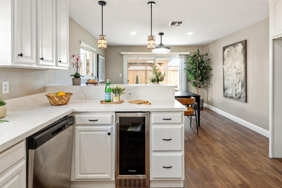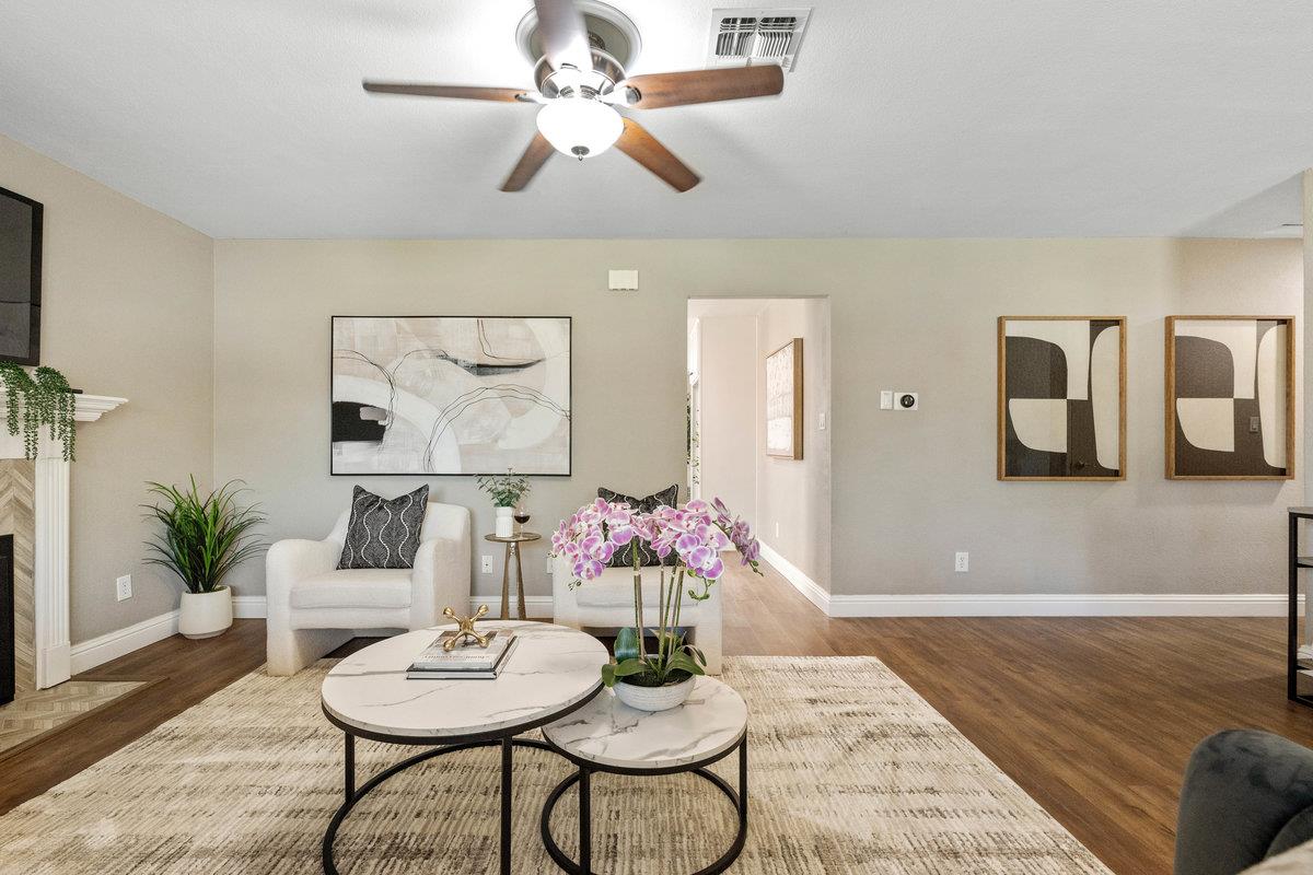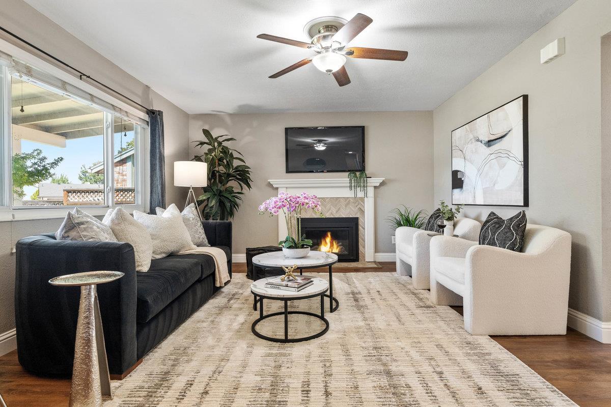 Welcome to 1800 McPeak Court! Nestled in a quiet cul-de-sac, this inviting 4-bedroom, 2-bath home offers a blend of comfort and modern updates. The thoughtfully designed kitchen features sleek quartz countertops, a double oven, and a built-in mini fridge. The cozy living room showcases a gas fireplace perfect for relaxing evenings. Wood flooring flows throughout the main living areas, with carpet in the bedrooms for added comfort. Step outside to a beautifully landscaped backyard, complete with updated stamped concrete, low-maintenance turf, a spacious gazebo ideal for outdoor gatherings, and a charming flower bed. Additional highlights include a 2-car garage and a highly desirable location close to schools, dining, shopping, and easy freeway access.