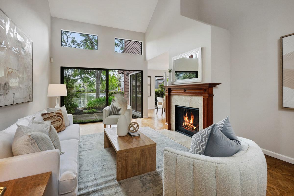 Coming home to the Chic Waterfront end unit . Experience the epitome of waterfront elegance in this stunning 3-bedroom, 2.5-bathroom end-unit townhome, offering the largest floor plan in the highly sought-after Harbortown community. Spanning approximately 2,100 sq ft, this corner unit is a rare blend of luxury, comfort, and convenience. A private gated courtyard welcomes you into a light-filled sanctuary. The spacious living room features sky-high ceilings, a striking wood-burning fireplace, and seamless flow to the expansive patio perfect for relaxing or entertaining.. The beautiful kitchen is a paradigm of style and function, complete with modern finishes and wine refrigerator. A family room, half bath, abundant storage, and an attached 2-car garage.. Upstairs, the large primary suite offers a cozy fireplace, soaring ceilings, and a private balcony overlooking greenery and water views. Two additional bedrooms one with its own balcony share a sleek full hallway bath. A convenient upstairs laundry room with washer and dryer. Enjoy resort-style amenities including pools, tennis courts, and scenic walking paths. With easy access to major highways, this serene retreat is just minutes from shopping, dining, and urban conveniences. Welcome home.